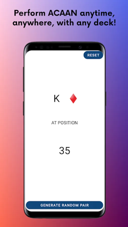 ACAAN is a classic of card magic. You choose one card and one number. The card appears on this position in shuffled deck. There are countless different methods to perform this trick. Acaanizer is one of those. With this app, you'll be able to perform this trick anytime and anywhere. All you'll need is a deck of cards and Acaanizer.