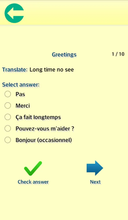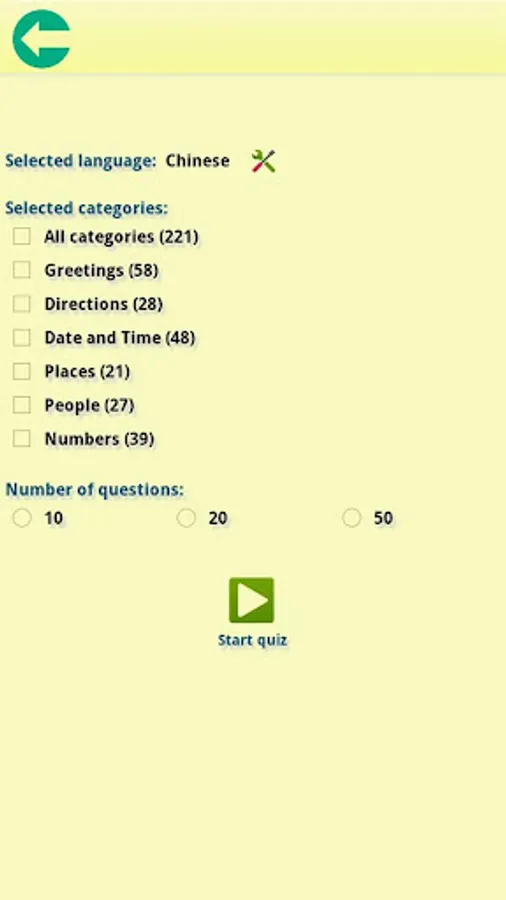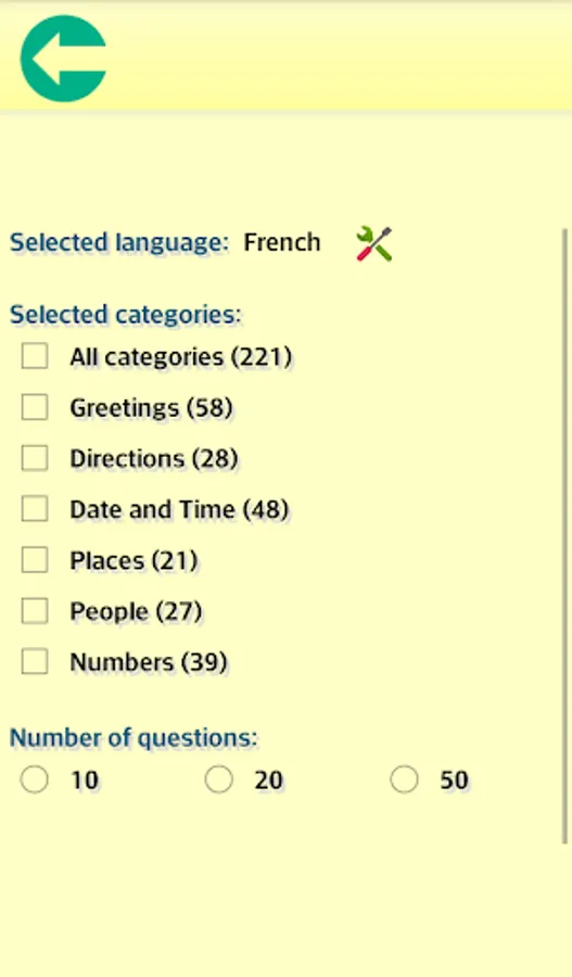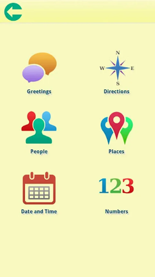 The learning categories done by native translators include: Greetings, Directions, People, Places, Date and Time, and Numbers.