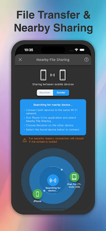 • FILE SHARING: Share files with other Android/iPhone devices through Bluetooth or Wi-Fi. Automatic search for nearby devices simplifies the process.