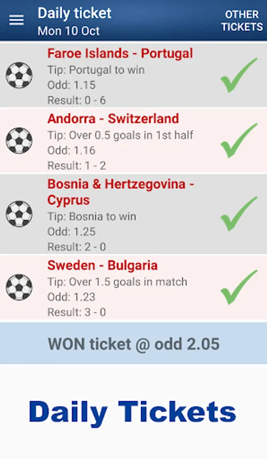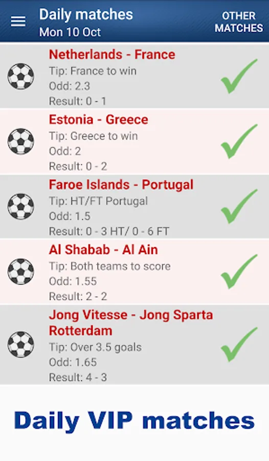 • Up to 10 VIP betting tips with higher odds (odds starting from 1.50 up to 2.50 in VIP section).