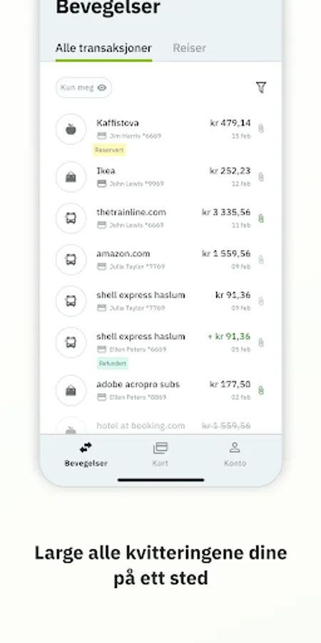 oversikt over transaksjoner, lar deg laste opp kvitteringer