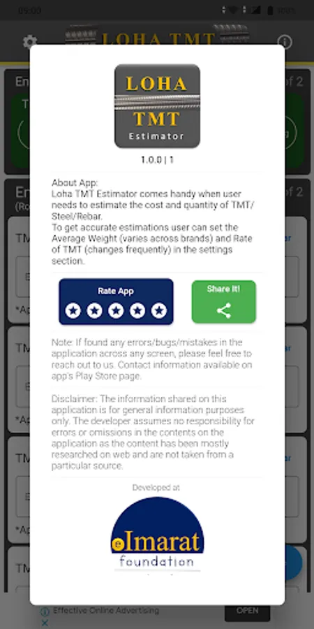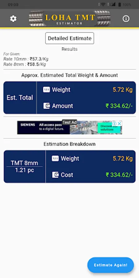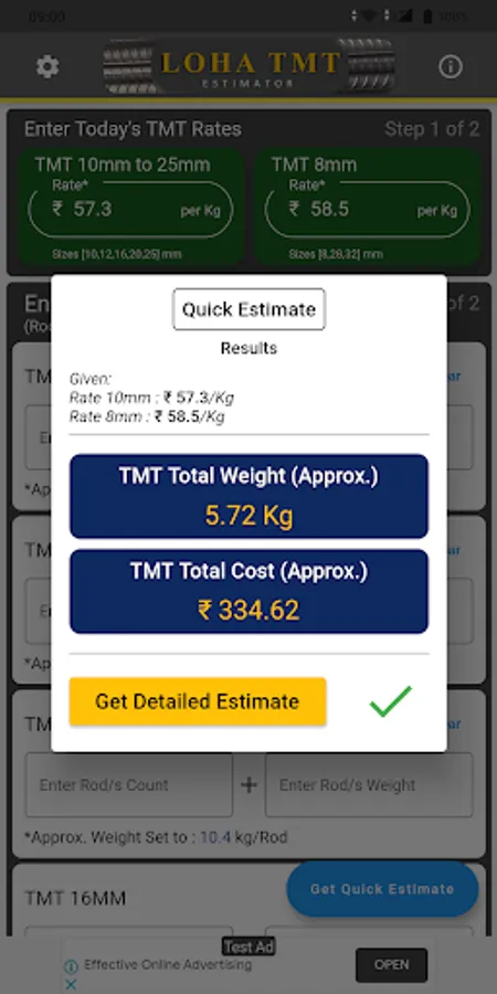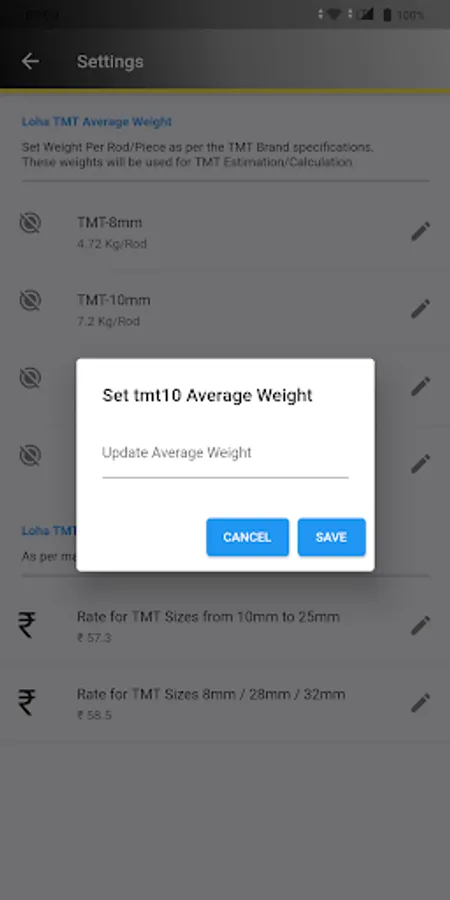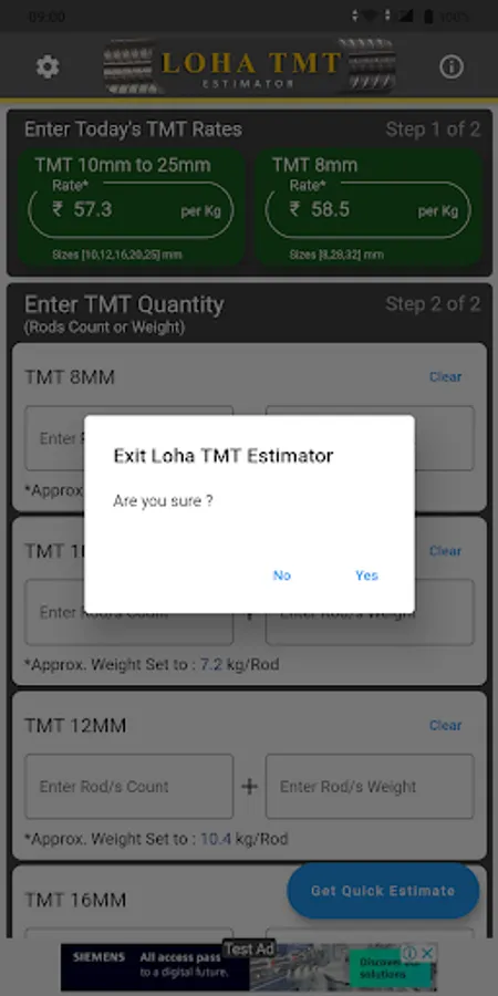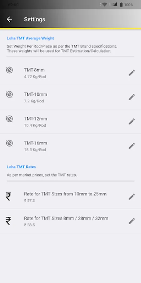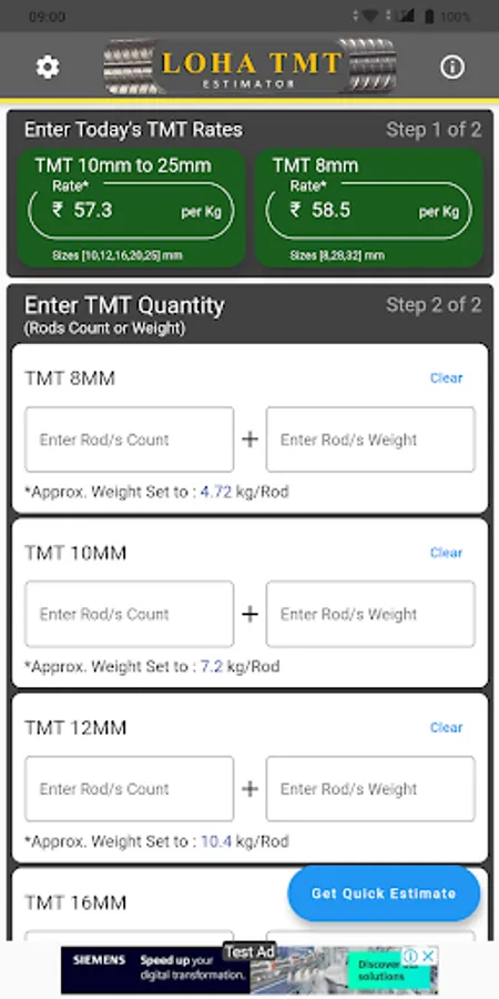 1) User will need to update the current market rate for the Rebars/TMT on the main screen or set the values in the settings page.