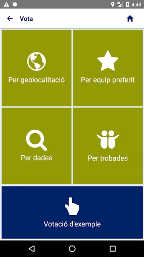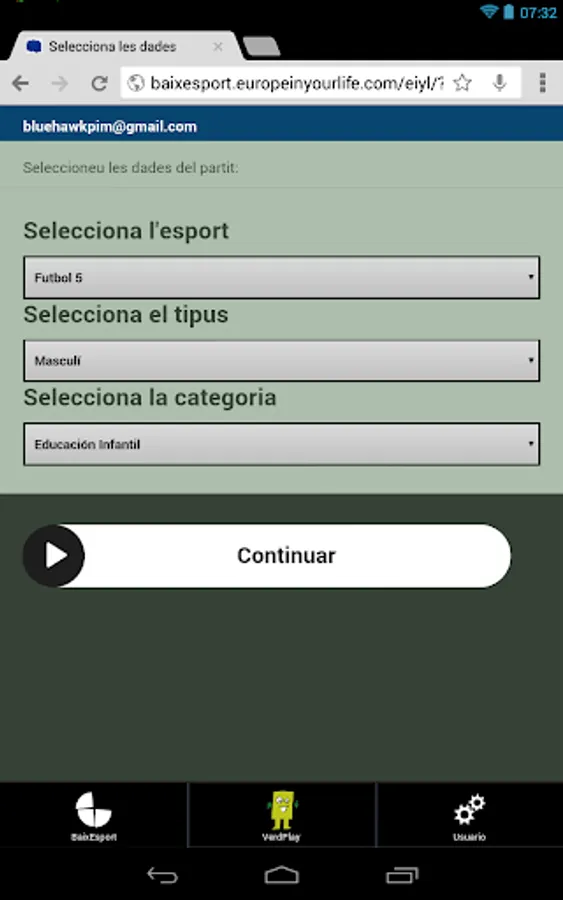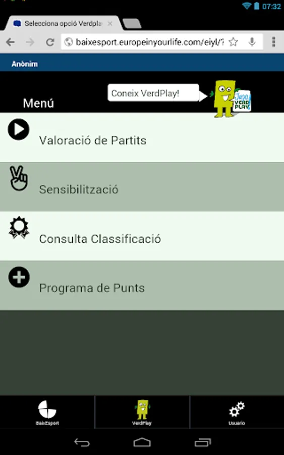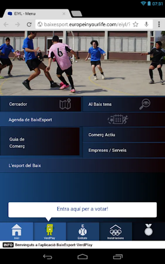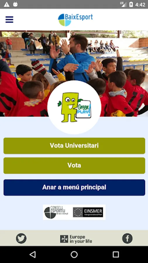 Play Play Green, part of the application linked to the competition School Sports Games Baix Llobregat whereby stakeholders (promoters games, coaches, tutors and tier public) to vote and participate in the outcome of the game. This search tool will make a change in the current competitive model and opt for an alternative really original and different compared to federated sport where values have a role.