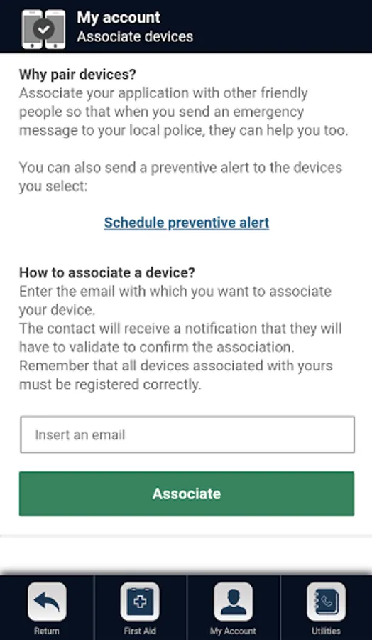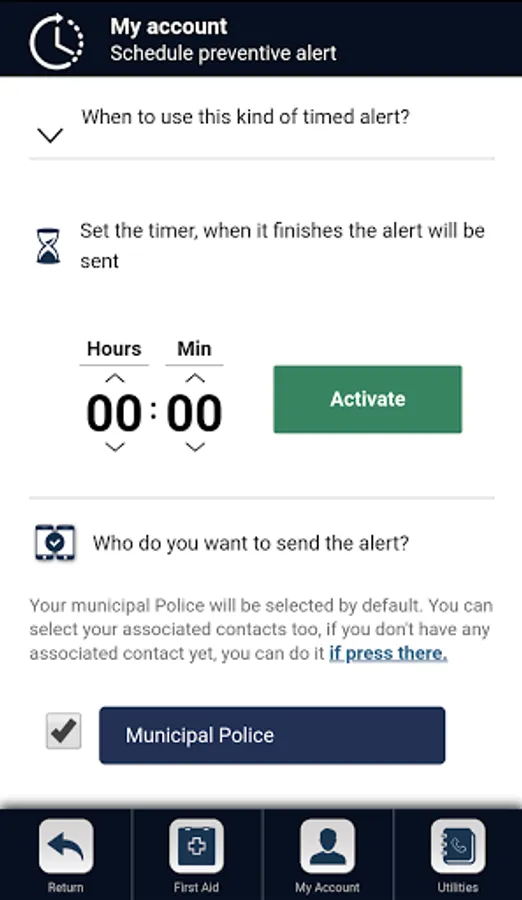 SCHEDULE A PREVENTIVE ALERT: Travel in complete safety by programming a preventive alert that warns whoever you want, including the Police of your city. CREATE YOUR OWN PERSONAL SAFETY NET.