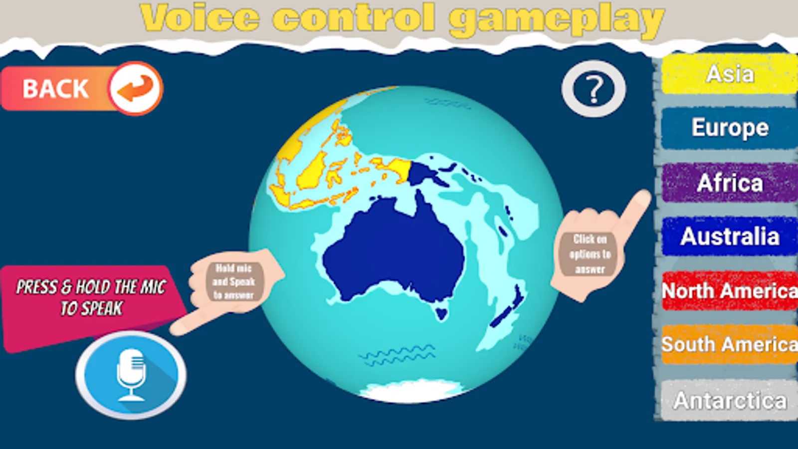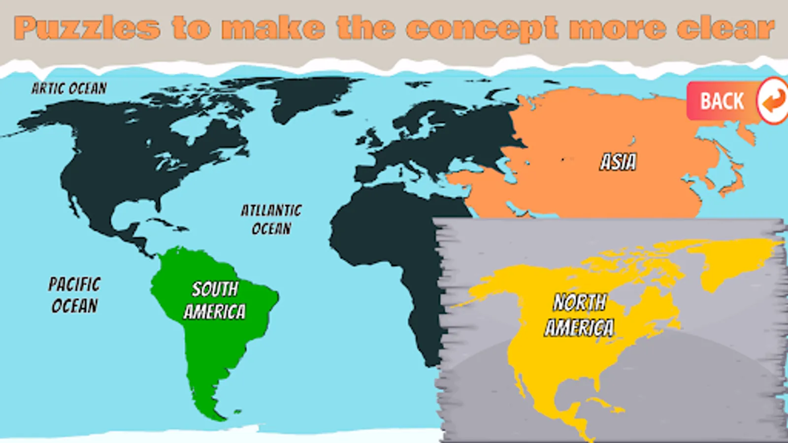 - Continents level lets you understand all the seven continents,its name and location relative to the oceans.