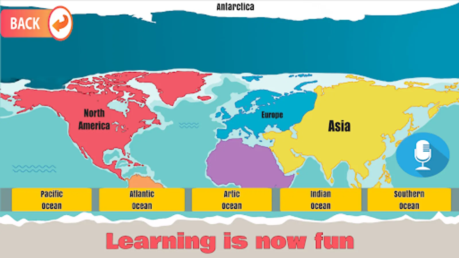 - Ocean level lets you understand all five oceans, its name and location relative to the continents.