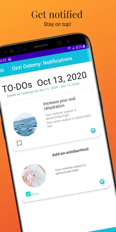 Ozzi makes it easy to track your ostomy outputs, urine outputs, and gives you personalized notifications to manage your hydration status.