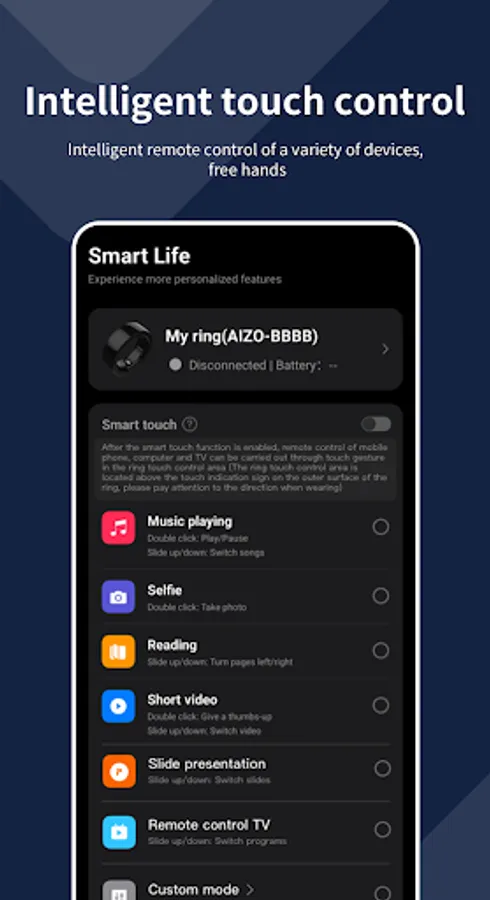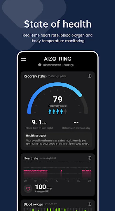 AIZO Ring is an app that managing sleep data from smart ring device and providing sleep health services, to help users record and analyze their sleep and activity status, easily understand their body status, provide professional and reliable guidance for improving sleep, and create a attentive personal sleep health butler.
