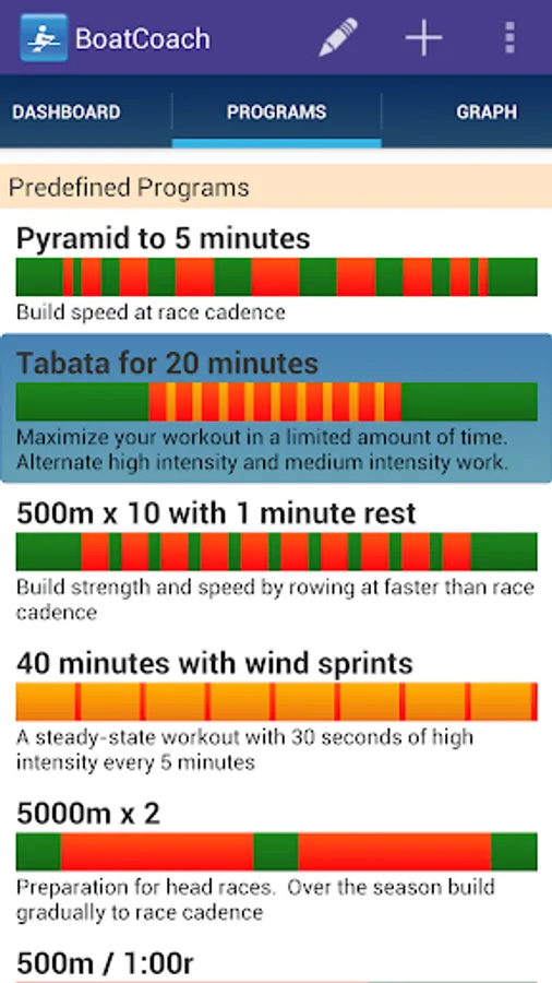 - Use 8 predefined programs including pyramids, tabata, 3 x 2000M, 10x500M, etc.