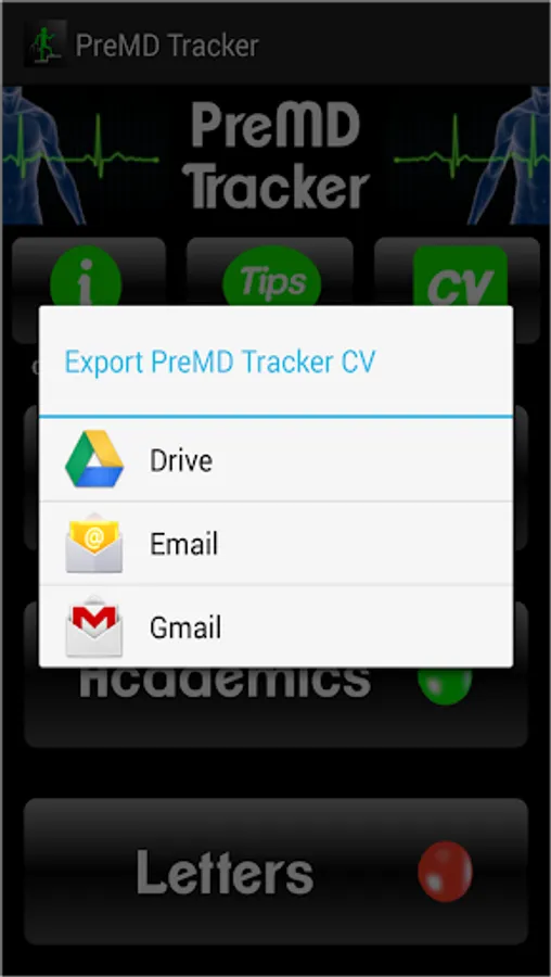 2. EXPORT PreMD Tracker CV- PreMD Tracker automatically compiles all of your entered Activities information and allows you to “Export a PreMD Tracker CV” in spreadsheet format via email with the click of a button.