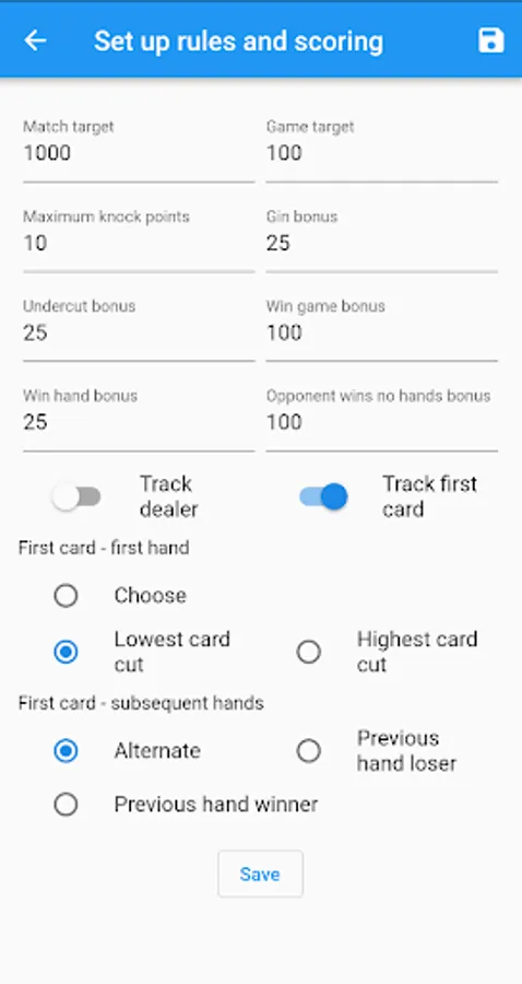 Includes a facility to set your own Gin Rummy scoring rules.