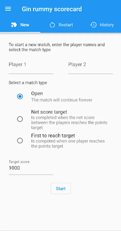 Matches can be set up to a chosen target point score.