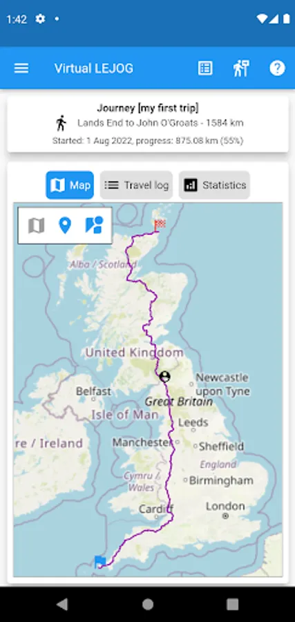 The app also supports group journeys, where you can invite your friends and colleagues to participate on the same virtual journey. With this option the app will display the progress of all group members and show the position of all group participants on the map displays.