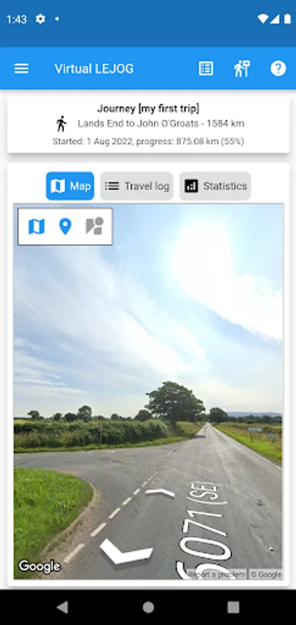 - Street view: this option will allow you to view your current virtual journey location using a Google Street view. This is a fun extra feature that allows you to view the wide range of terrains that exist over the route.