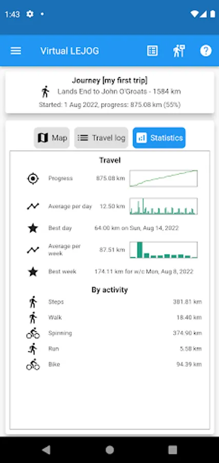 - Optionally view the user's current virtual journey location via a Google 'street view' - great for viewing the different terrains the journey covers