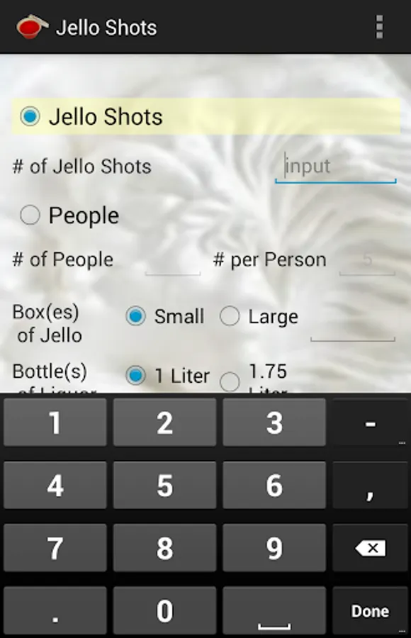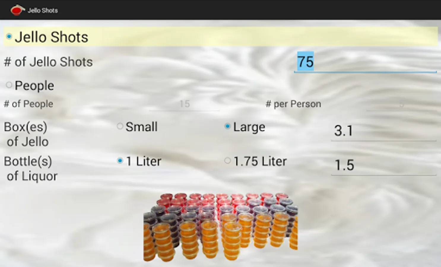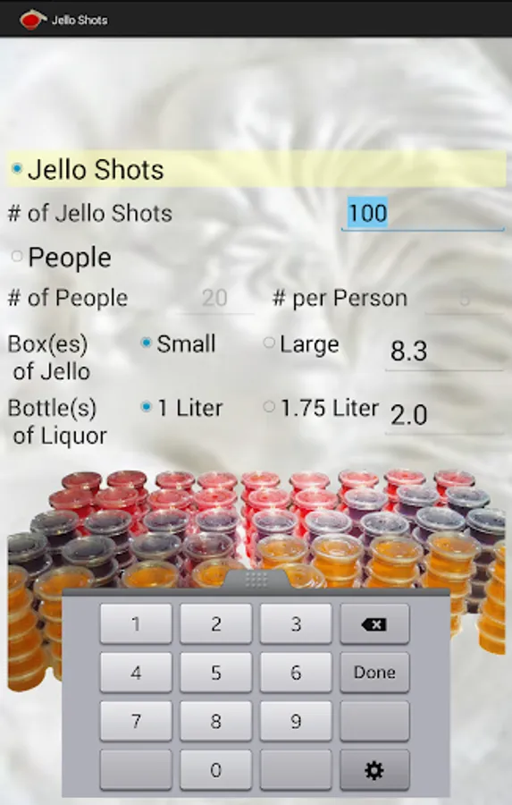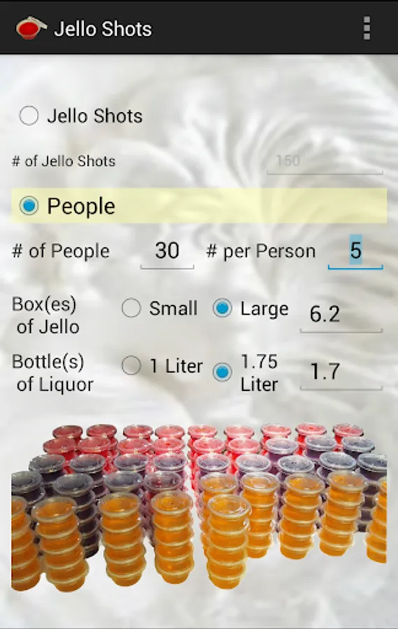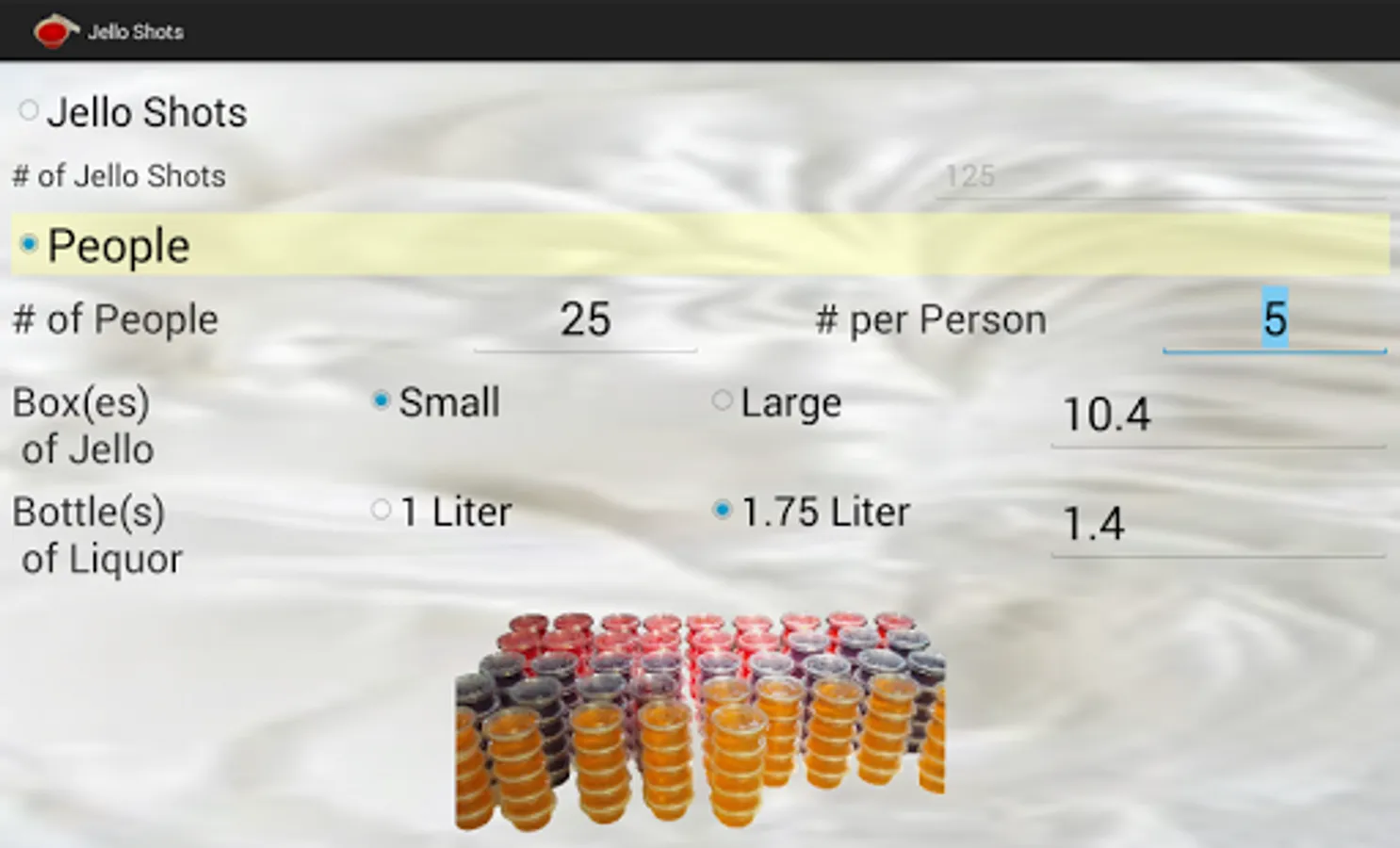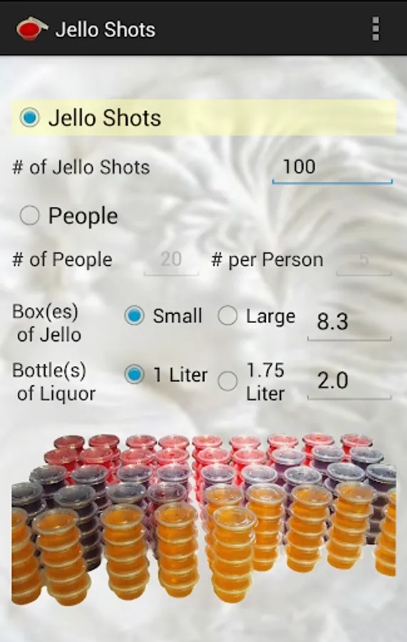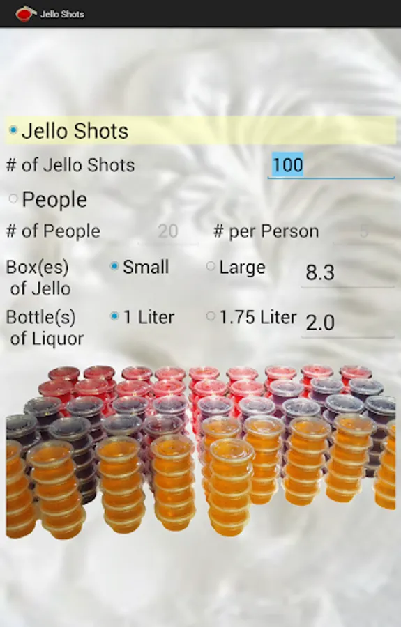 Calculations can be based on desired # of jello shots or by number of people and how many per person.
