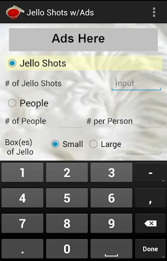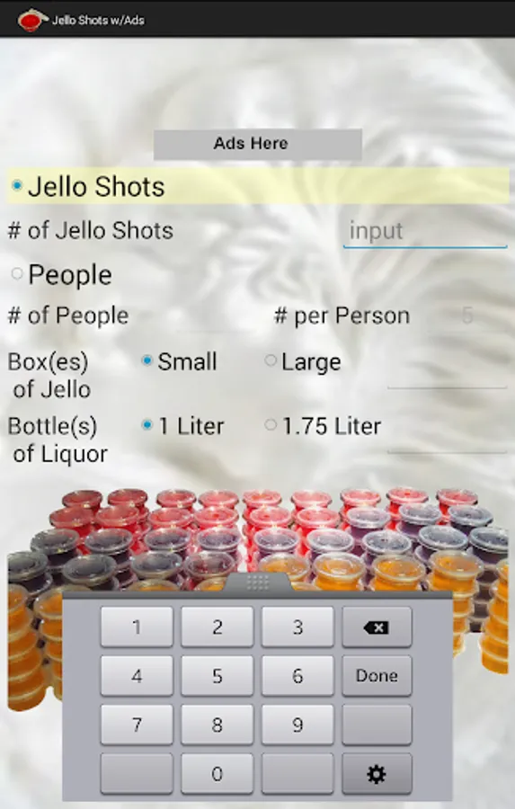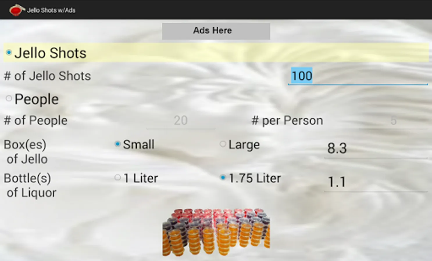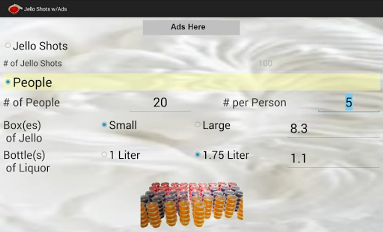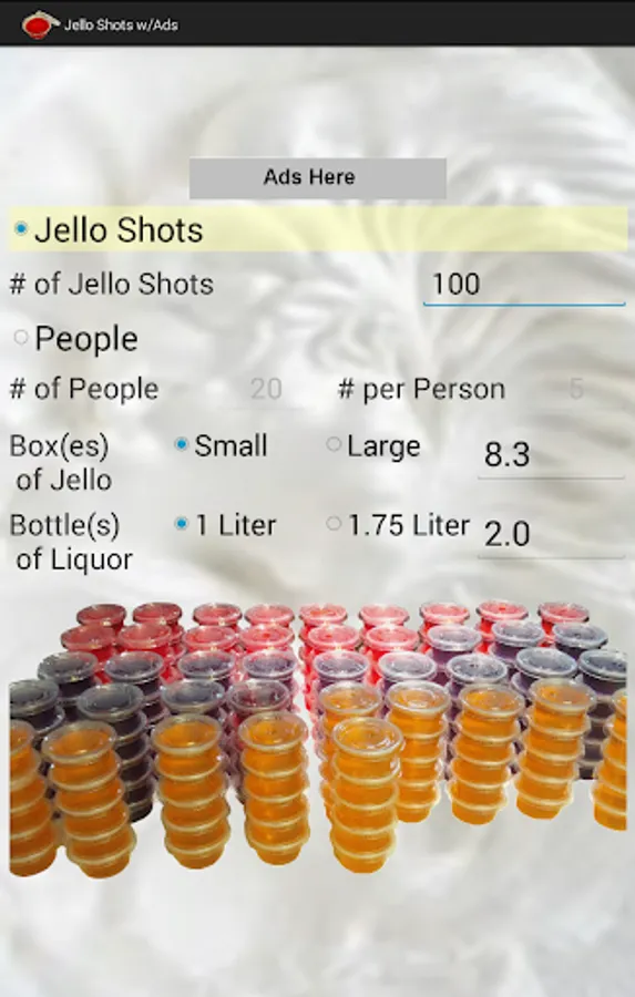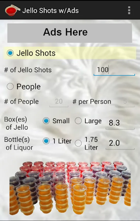 Calculations can be based on desired # of jello shots or by number of people and how many per person.