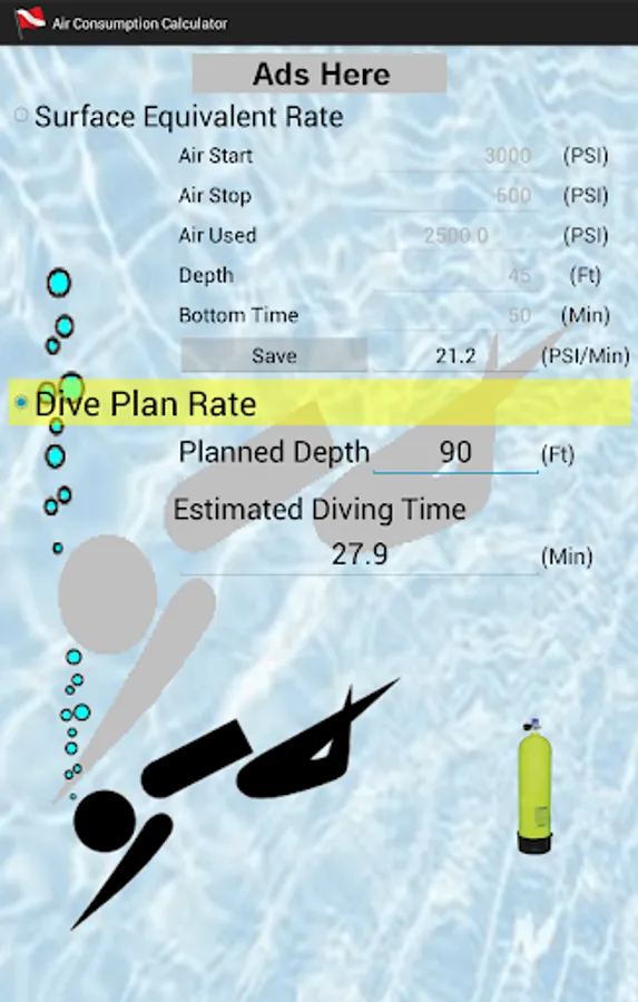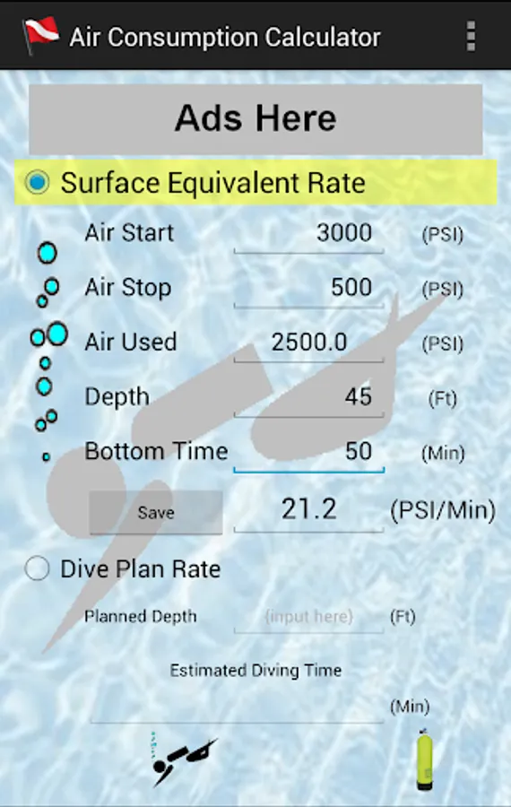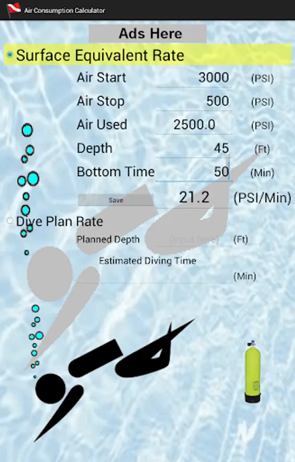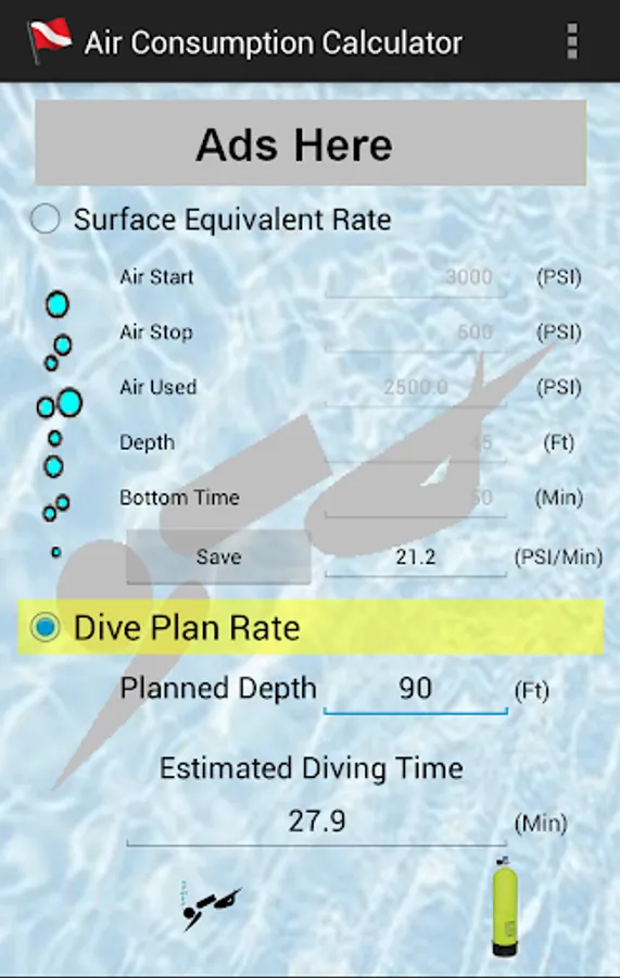 Scuba Diving Air Consumption Calculator is an app that allows you to input past dive(es) air, depth, & bottom time information to calculate your air consumption Surface Equivalent Rate. Then you can input the depth of your next planned dive and it will calculate your air consumption Estimated Diving Time (how long your air should last).