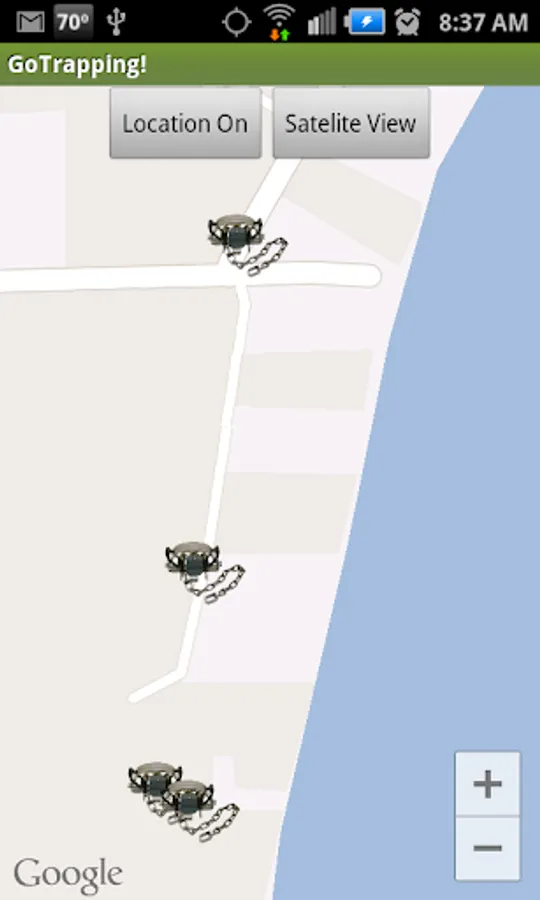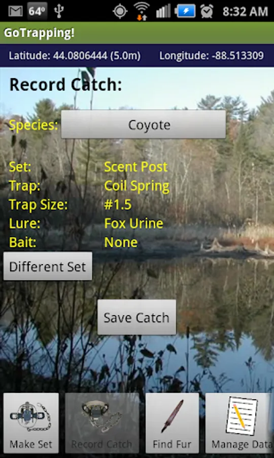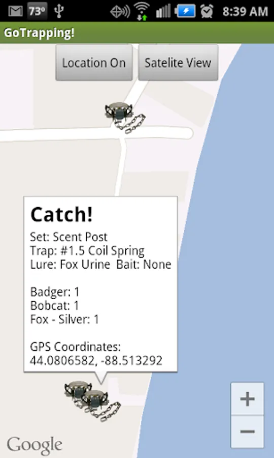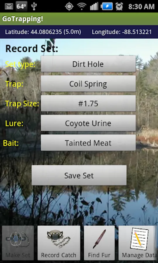 You can set the trap information from the comfort of your living room, by using the map page. Simply zoom in on the map until you see the location for the trap, tap the screen, and then enter the information for your trap. This way you don't have to worry about losing your phone in the swamp!