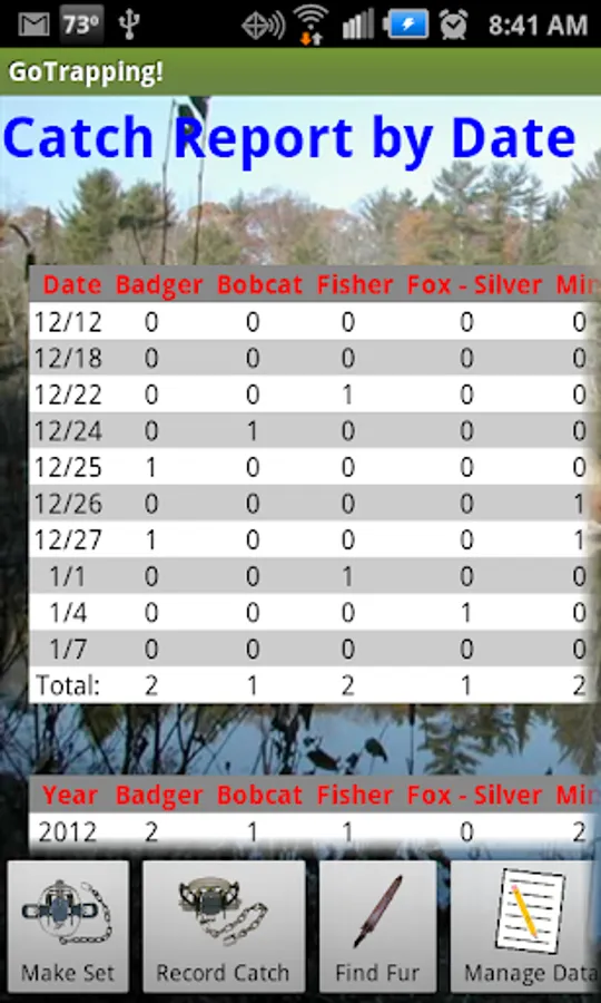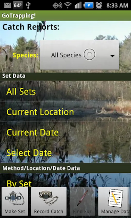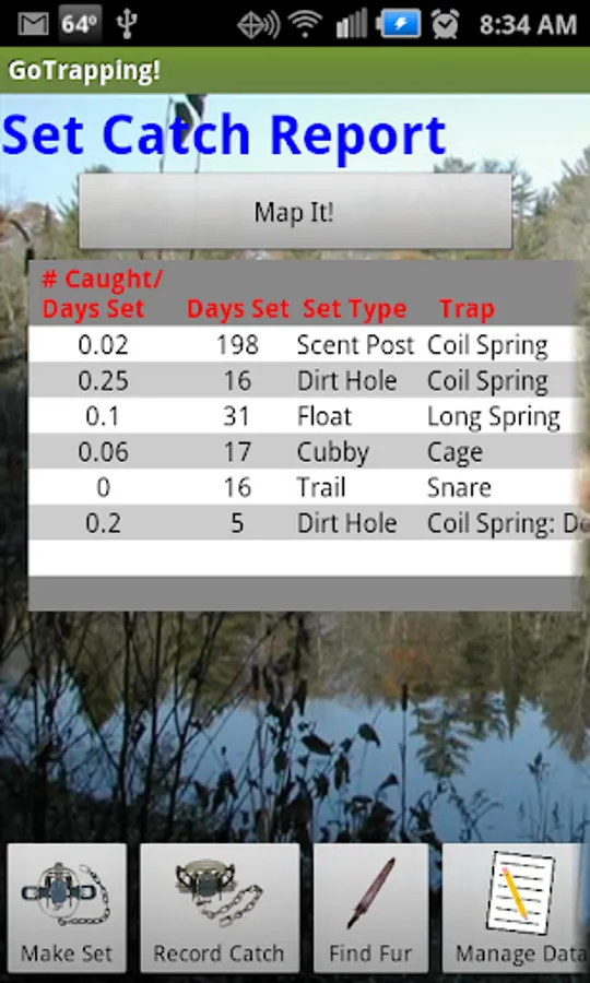 GoTrapping! is an app designed to support the recording and analysis of trapping data. The app allows the trapper to record set type and location and catches made at those sets. Set types, traps, lures, and baits can be added or deleted as needed. Targeted species can also be added and deleted. The app provides the ability to analyze set performance in a variety of ways so that the user can determine the best sets to make for targeted species as well as have a record of catches and sets.