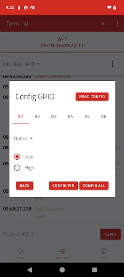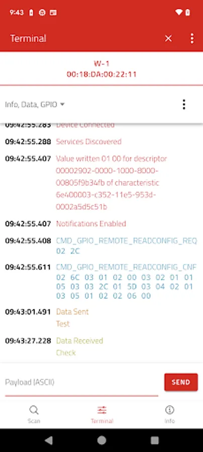 The user can send binary data over a Bluetooth LE link using the integrated Profile of Proteus.