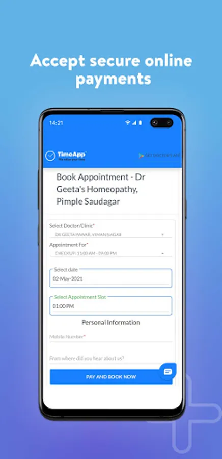 TimeApp is a simple app made for Doctors, Clinics and Wellness centers. Get appointments and receive payments from existing patients and you will get visibility on TimeApp portal https://timeapp.in to new patients through your Google SEO listing.