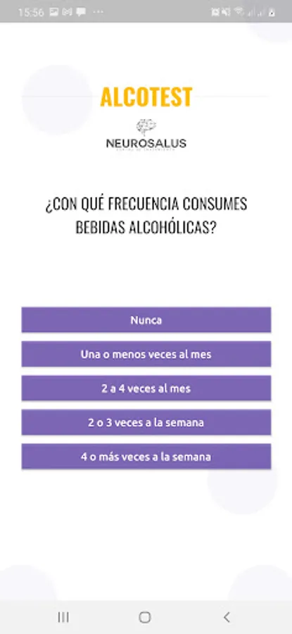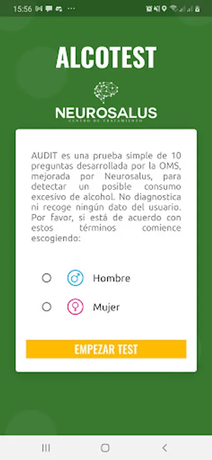AUDIT is a simple 10-question test developed by the WHO, enhanced by Neurosalus, to detect possible excessive alcohol consumption. It does not diagnose or collect any user data.