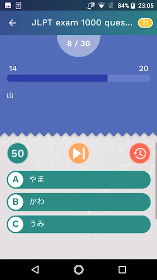 This is a JLPT game to answer within 20 seconds. If you don't know, you can use the 50/50, skip, and time stop functions as acquisition points.