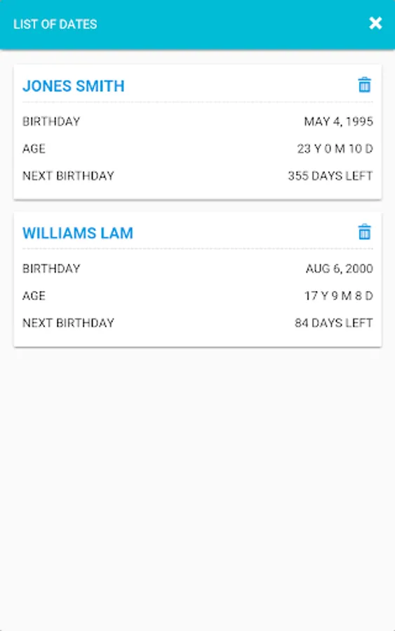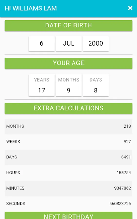 We are providing a very simple user interface that easily calculate your age and birthday, and also you can add as many family and friends birthdays and important days as you needed, which is useful for keep tracking.