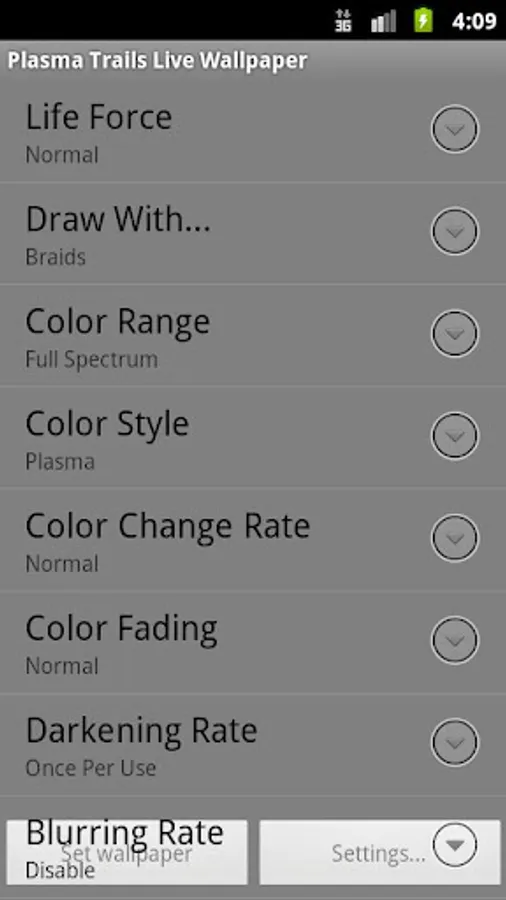 Set life force, change colors, draw with solid trails or change to stars or braids. There are hundreds of possible configurations to make this live wall paper unique.