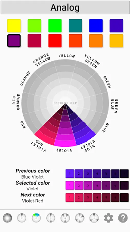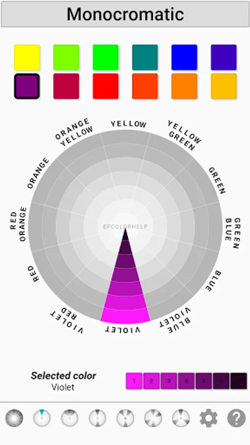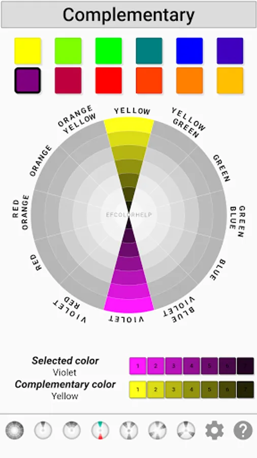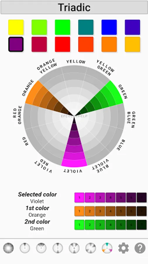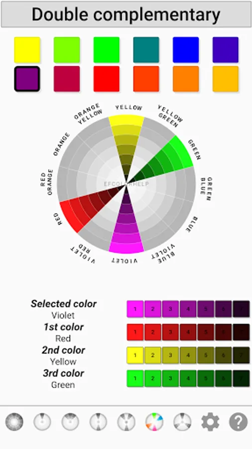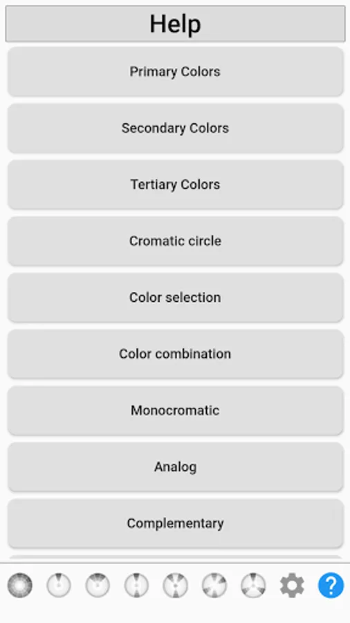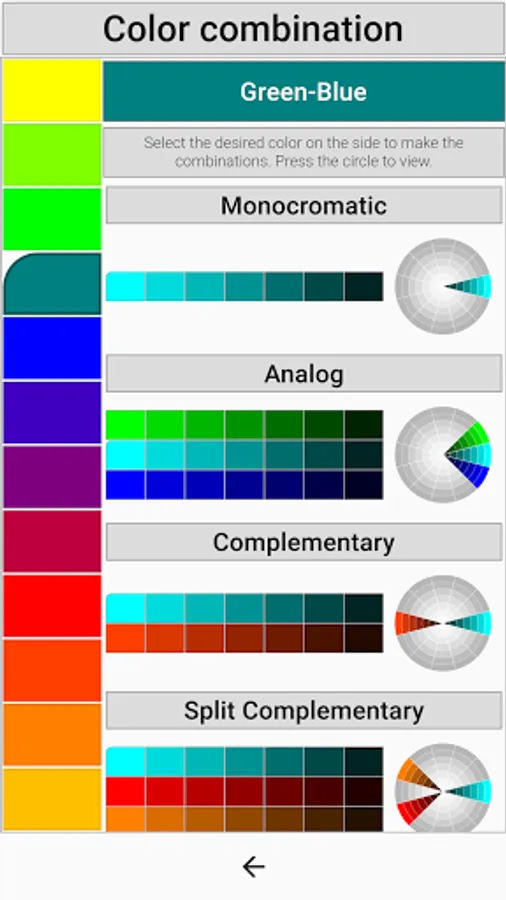 - Screen for viewing color combinations on the same page, with color selection and instant visualization of the combination applied to all circles, in addition to allowing you to select a specific circle to analyze it in detail.