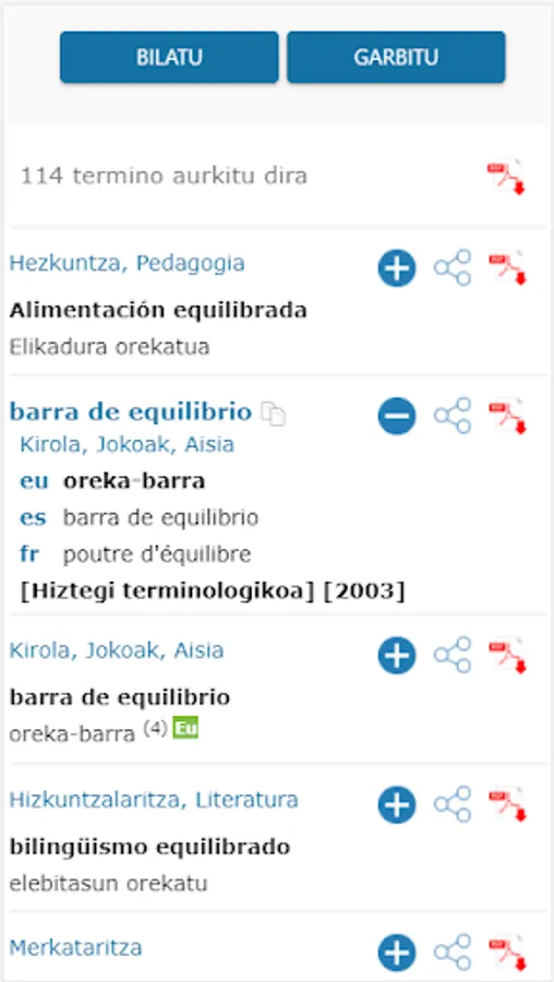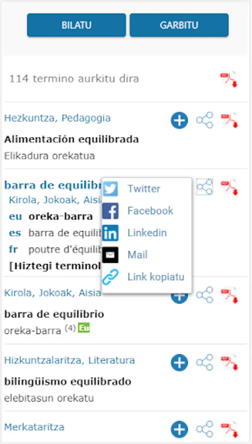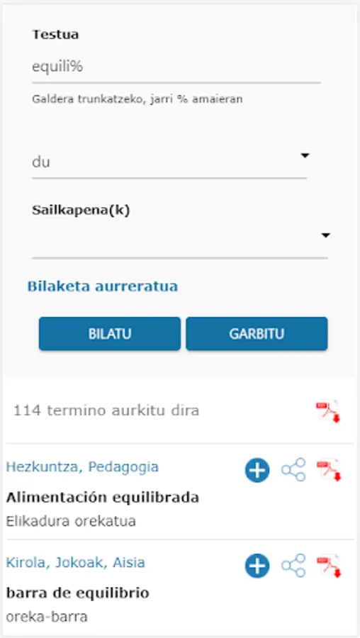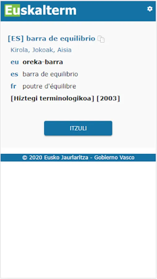 With this application we can make queries EUSKALTERM specialized terminology, the Public Bank Terminology (www.euskara.euskadi.net/euskalterm). In the terminology Bank approved and recommended by the Committee on Terminology of the Advisory Council is composed Euskera. The terms recommended by the Commission are marked 4 plus the symbol Eu; terms are marked 3 are also terms accepted by the Commission but are not priority. Keep in mind that when you do a search, you can specify the scope of use. For example, if you search for 'resource' and not sum the field, the result of 119 terms we appear, so it is recommended to specify the area in which we are interested in the term 'Computer', 'law', 'Environment' or someone else.