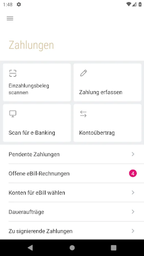 Release eBills, scan QR-bill or payment slips and record domestic payments conveniently on your mobile device. You can also query your pending payments.