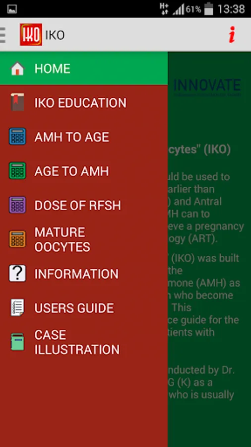 "Indonesian Calculator of oocytes" (IKO) was built based on the result of research on the Development of Anti-Mullerian Hormone (AMH) as a Biomaker Biological Age Women who Become FKUI Best Scientific Paper in 2011. This application can be used as reference guide for the physician when consulting with Patients with infertility disorders.