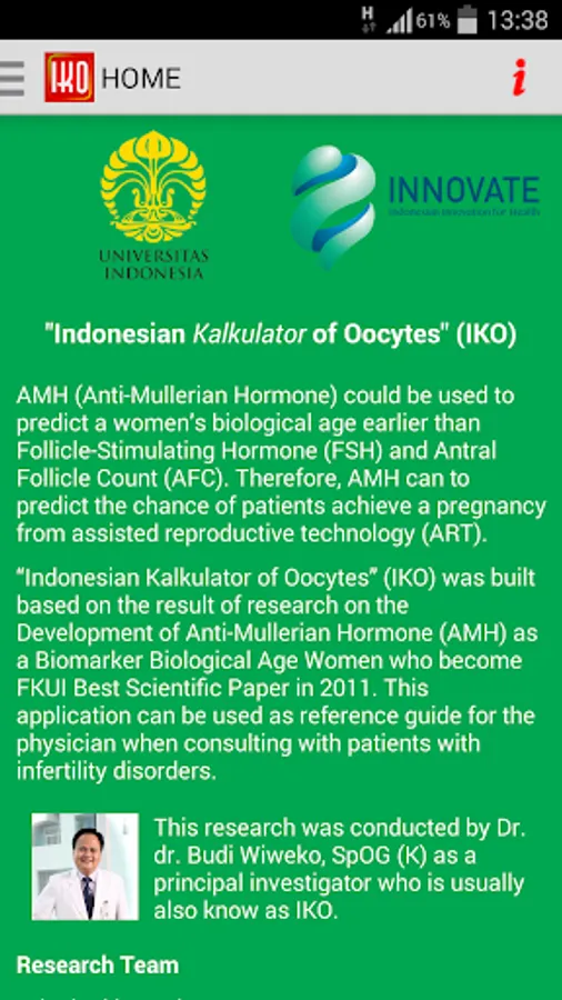 "Indonesian Calculator of oocytes" (IKO) was built based on the results of research on the Development of Anti-Mullerian Hormone (AMH) as a Biomarker Biological Age Women who became Best Scientific Paper in FKUI 2011.
