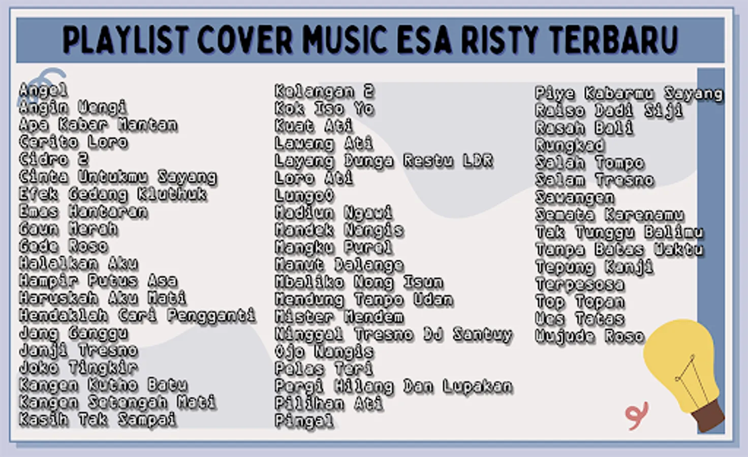A collection of the latest Javanese Esa Risty Dangdut Cover Songs, the latest Mp3 Offline collection as follows:
