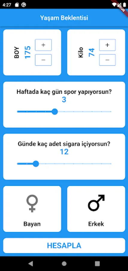 It wants our height, weight, weekly sports activity, number of cigarettes we consume daily, and our gender.
