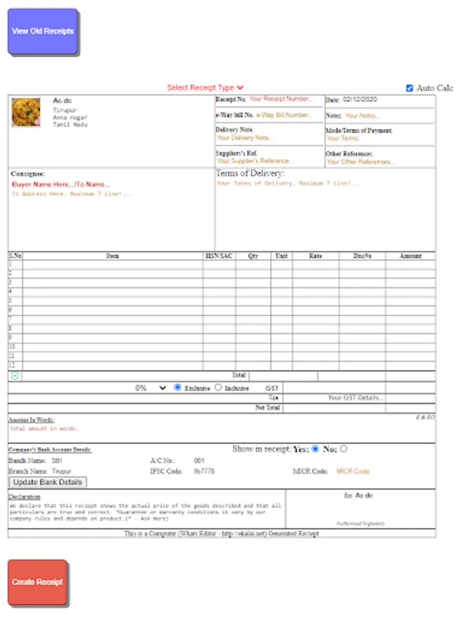 Quick Invoice for create invoice, bill, quotation, estimate, memo, purchase order, inward, outward and service bill... etc.. with GST exclusive, inclusive automatic calculation.