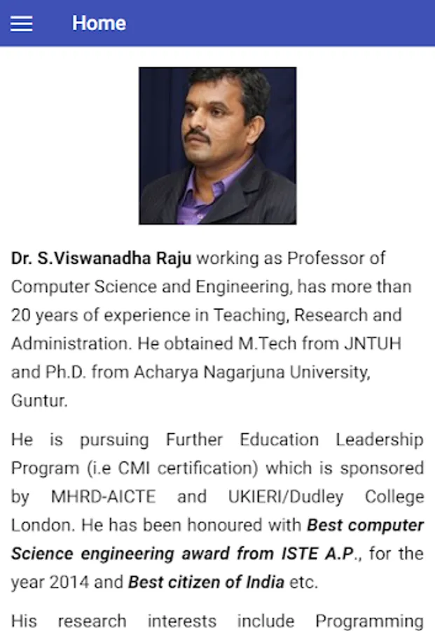 Dr. S.Viswanadha Raju working as Professor of Computer Science and Engineering, has more than 20 years of experience in Teaching, Research and Administration. He obtained M.Tech from JNTUH and Ph.D. from Acharya Nagarjuna University, Guntur.