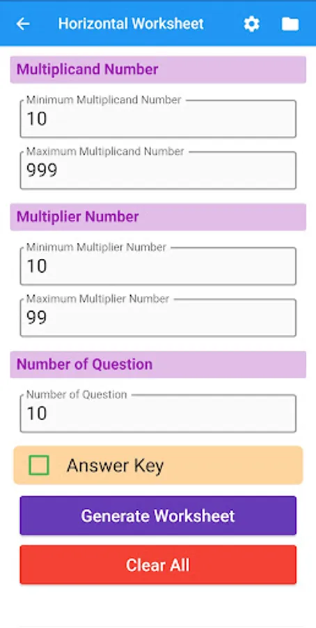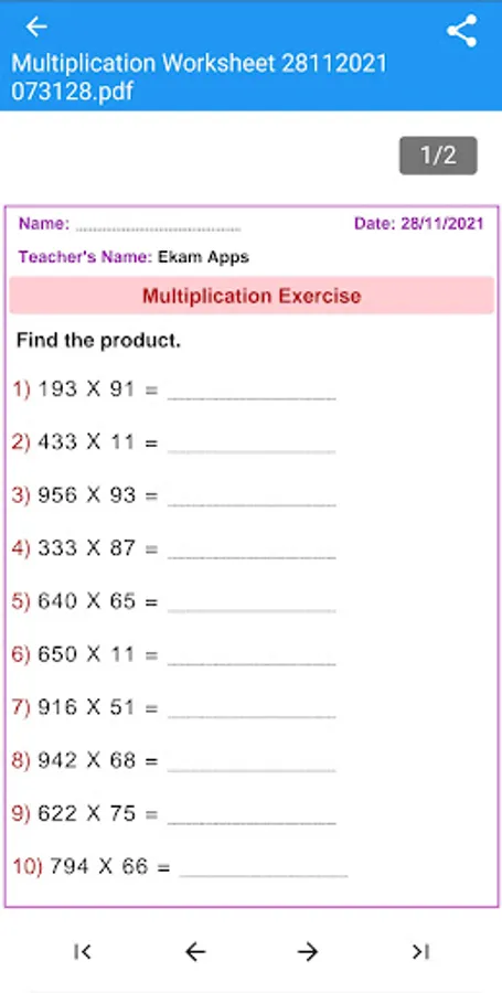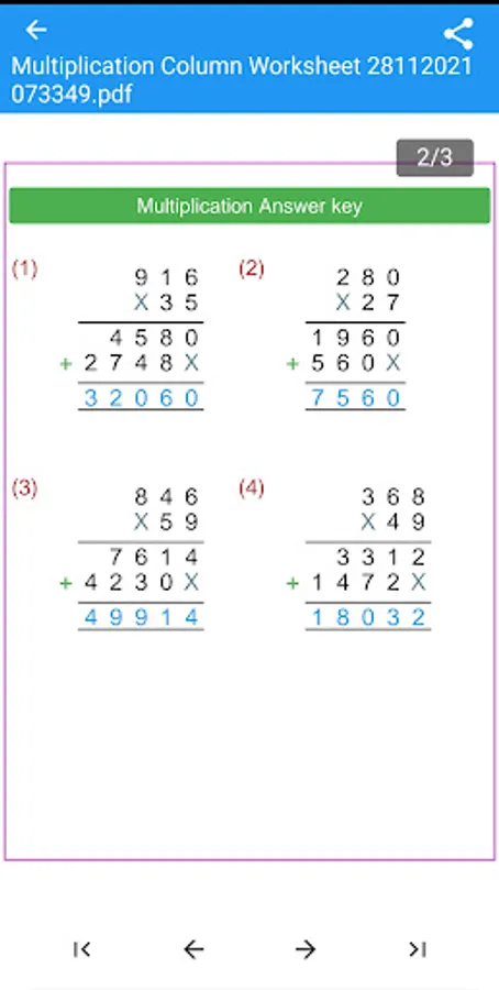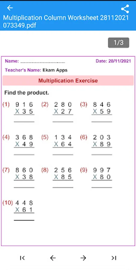 This app solve multiplication sums in long method or column method. This app also designed to generate multiplication worksheets in printable pdf. This app is capable to generate pdf worksheets with answer keys.