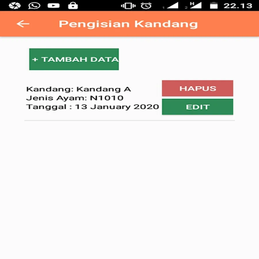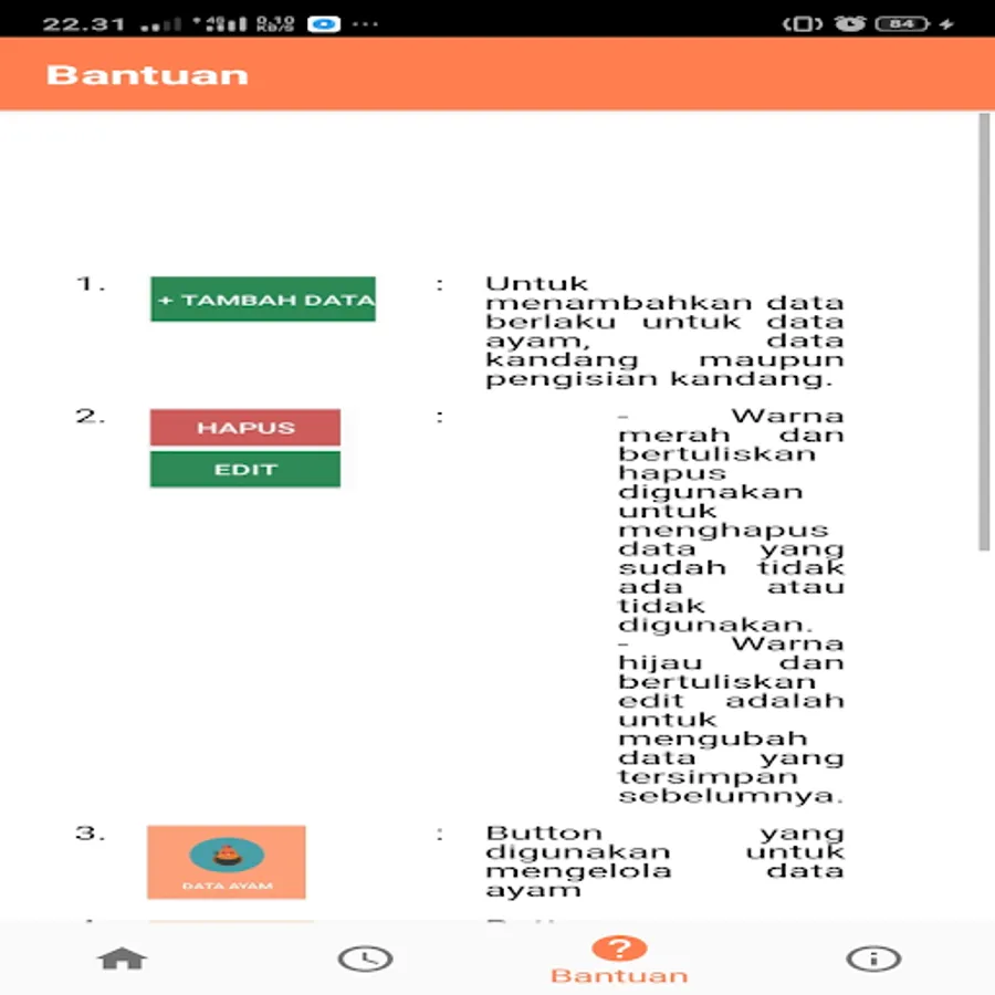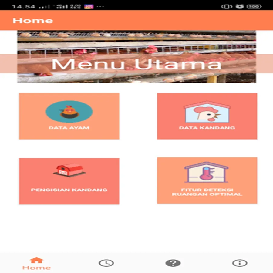 Tidak perlu melakukan login dan registrasi untuk melakukan penginputan data karena penyimpanan bersifat lokal. Bisa menambahkan data ayam , kandang dan detail kandang tanpa harus terkoneksi dengan internet dan langsung tersimpan pada aplikasi (penyimpanan bersifat lokal). Halaman awal yang terdiri dari 4 menu yaitu data ayam, data kandang, pengisian kandang dan Fitur Deteksi Ruangan Optimal. Pada menu penjadwalan adalah setting notifikasi pengingat jam makan ayam. Dapat menambahkan jadwal jam baru untuk fungsi selain jadwal makan (opsional). Melihat keterangan suhu , intensitas cahaya dan kelembaban saat ini serta cek status apakah sudah ideal atau belum. Menentukan jumlah lampu untuk instalasi perancangan ruang penetasan pada fitur Perancangan. Terhubung pada penyedia layanan cuaca untuk mengetahui kelembaban aktual berdasarkan longitude dan lattitude.