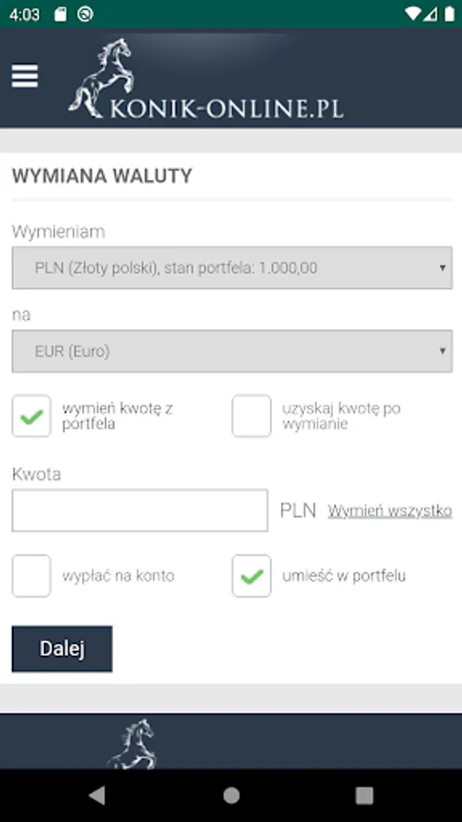 With the official mobile application nearest exchange office Konik-Online.pl you with a very simple and friendly way to exchange currency. The application enables: