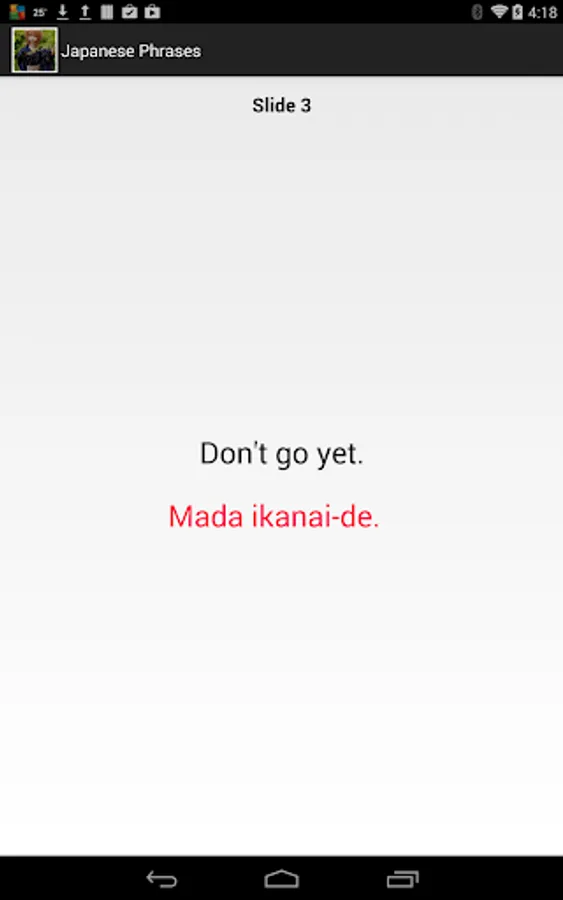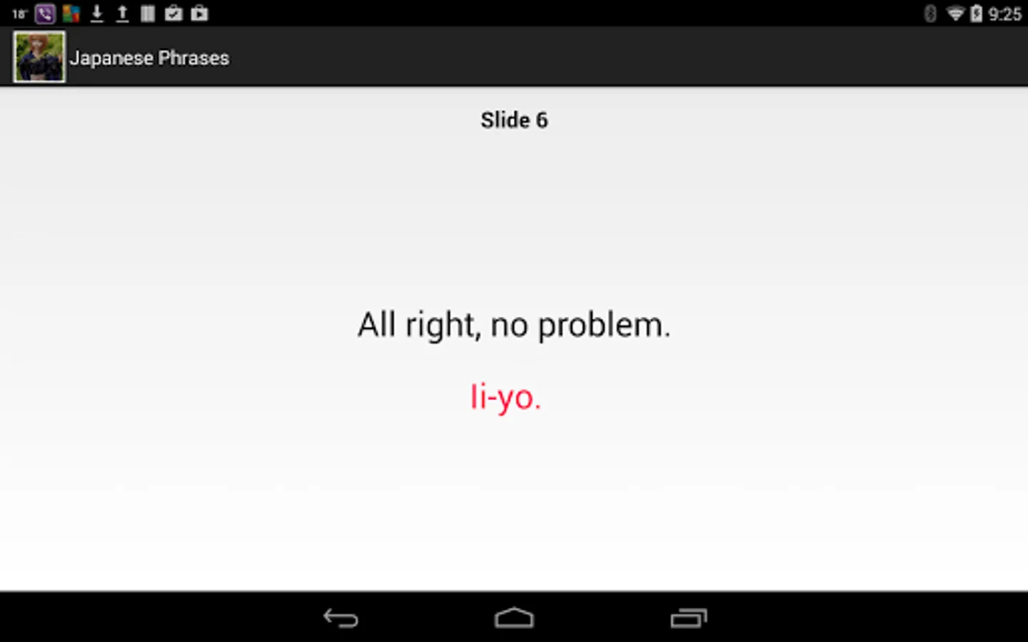 This app shows presents over 200 useful everyday Japanese phrases. After the installation is complete you may have to close and open it again. Swipe forward or back to move between slides. You can use the app in the offline mode. No Internet connection is required.