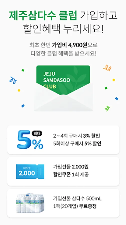 For the first time subscription fee of KRW 4,900, a gift of Jeju Samdasoo 500mL 1 pack and a discount coupon of KRW 2,000 are provided, and a 3% automatic payment discount for purchases of 2 to 4 times / 5% automatic payment discount for purchases of 5 or more times are provided.