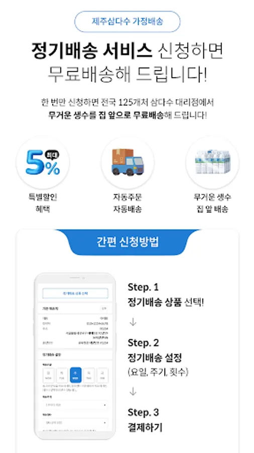 Samdasoo delivery agencies in 125 locations across the country regularly deliver heavy bottled water to your door for free according to the requested day, frequency, and number of times!
