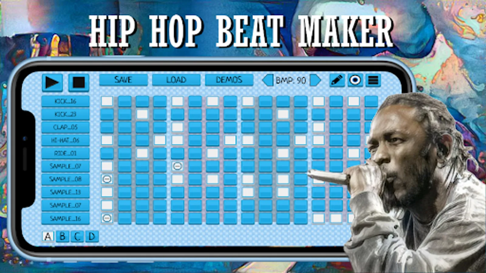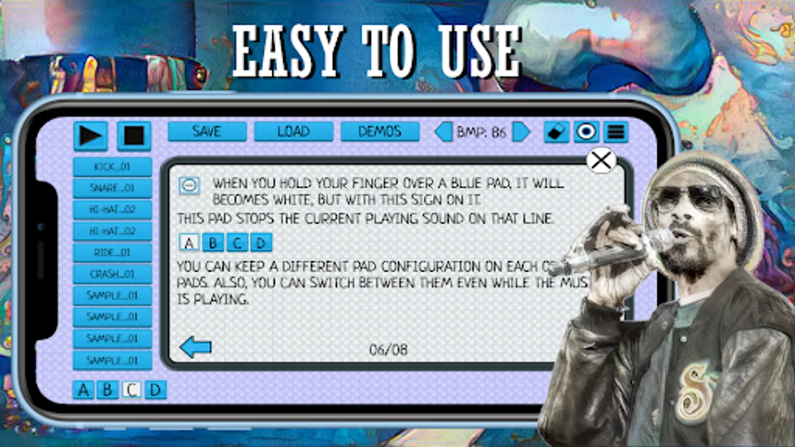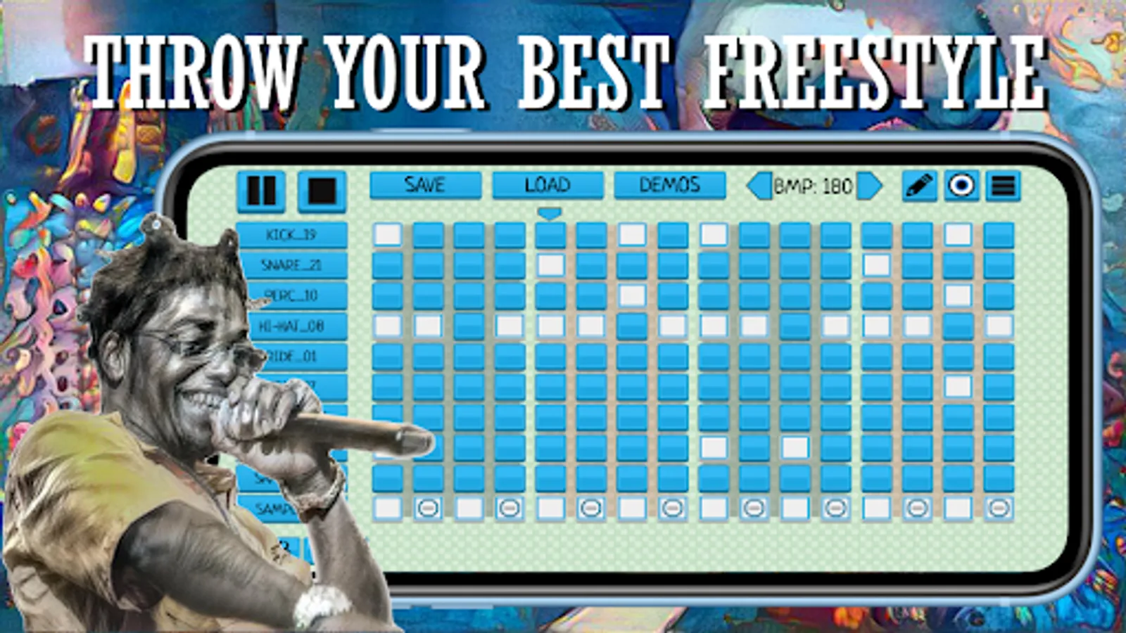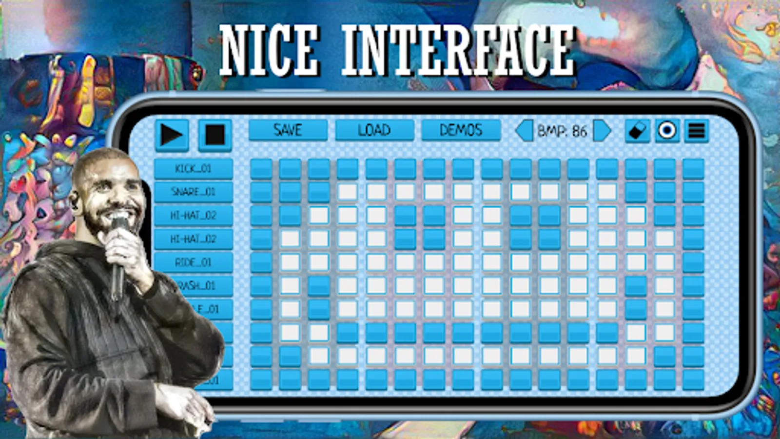 Easy beat maker, just selects the B.P.M. and the sound you like and press the pads to place the sounds. This makes it easy and fast to make your new hip hop beats to rap your trap music.