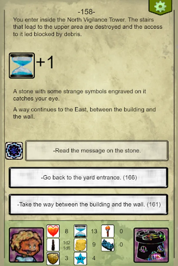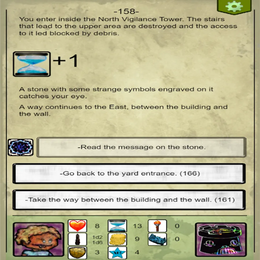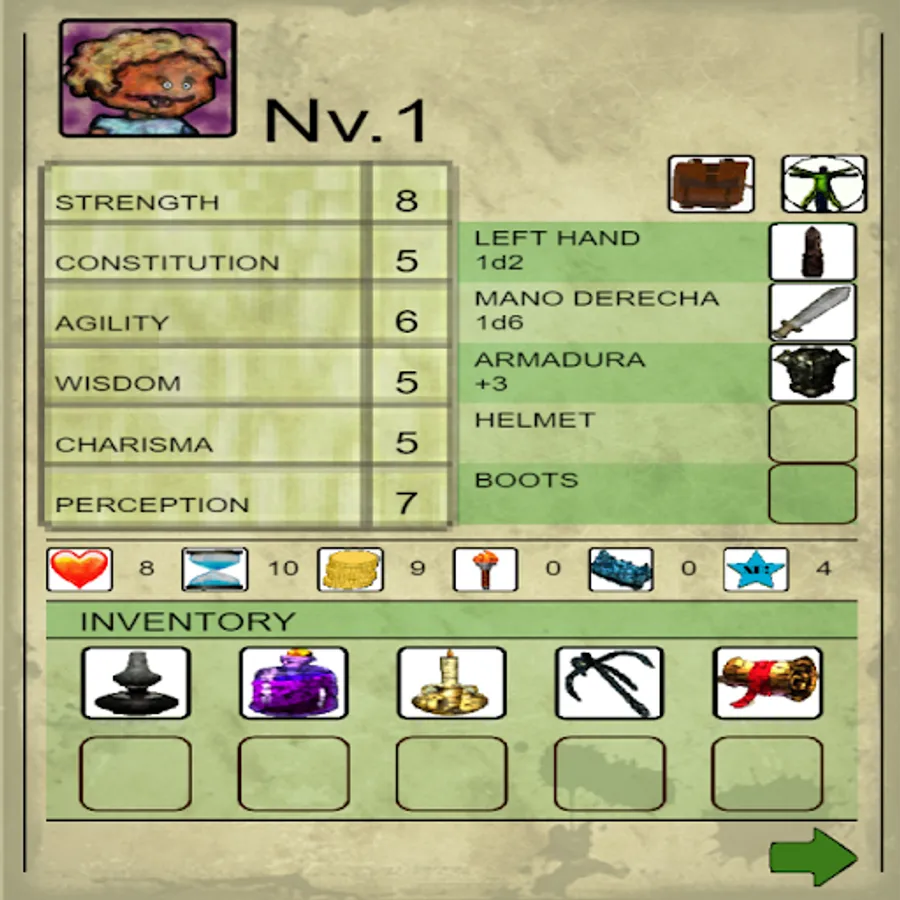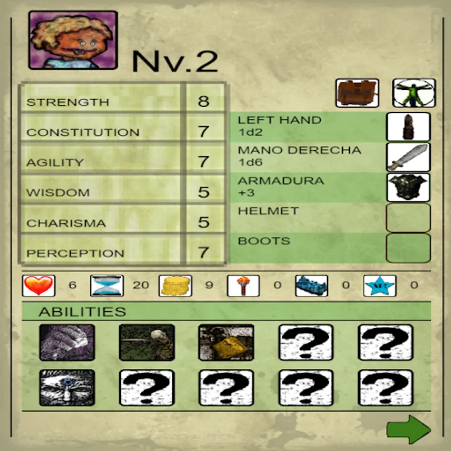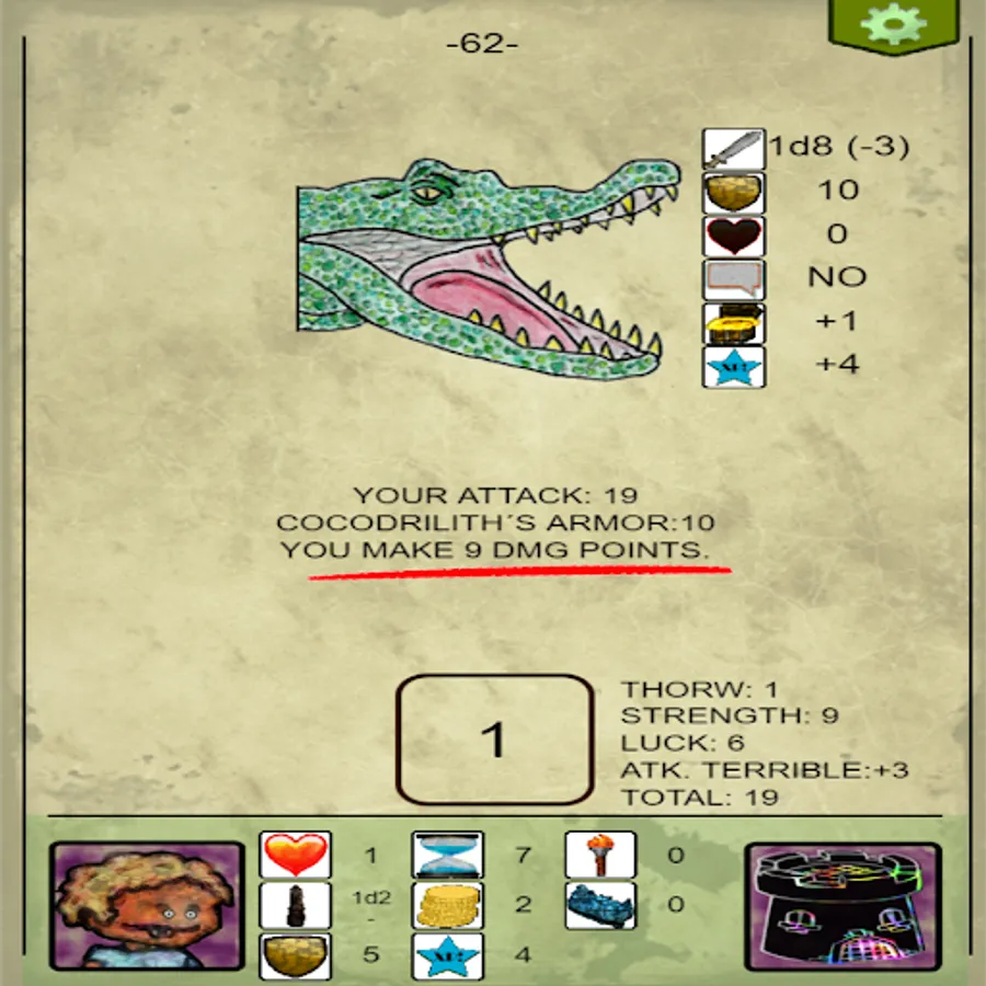 The protagonist has some initial characteristics: strength, constitution, agility, wisdom, charisma and perception. Depending on the level of these attributes during the gamebook it will be easier or more difficult to perform certain actions. Through the combats you gain experience, with which you can modify these values.
