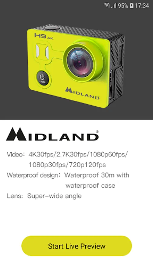 Midland H9 allows you to see what your camera sees on your smartphone in real time. You will also be able to take photos and record videos by using your smartphone as a Wi-Fi remote control. In addition, use it to download files from your camera and share your favorites via social media.