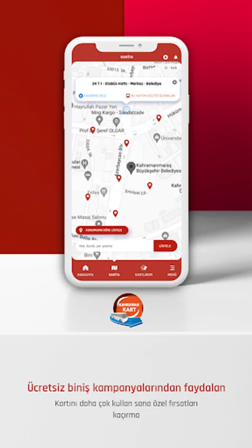 With the KahramanKart application, you can see the stops around you on the map, track how long your bus will arrive, and monitor the lines passing through the stop. You can add stops, lines or any point you want to your favourites, set an alarm according to bus arrival times and receive notifications before your bus approaches the stop you want.