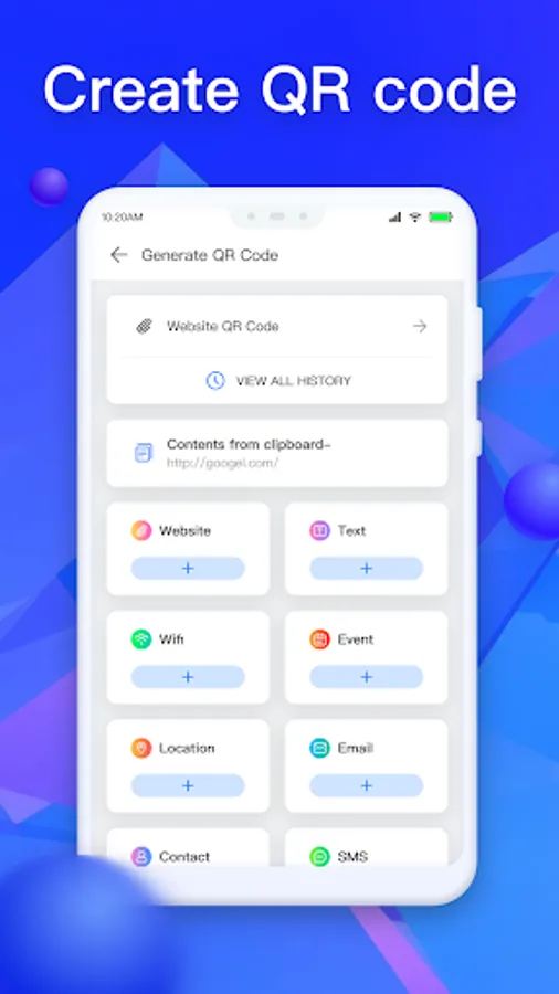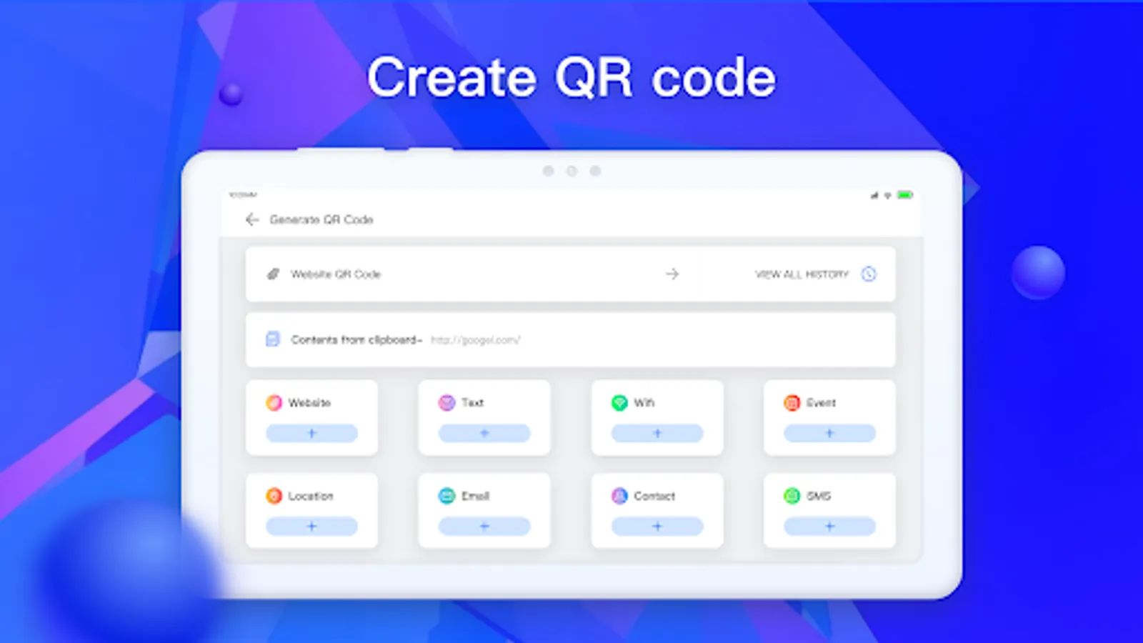 QR code scanner, barcode reader app also has a QR generator feature allowing you to generate your own QR codes with different types easily.